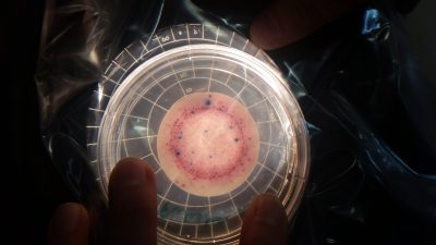 E. coli sample: colonies are dyed blue