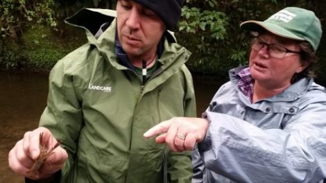 NZ Landcare Trust coordinator Alastair Cole examines a koura (freshwater crayfish) with a cit sci workshop participant