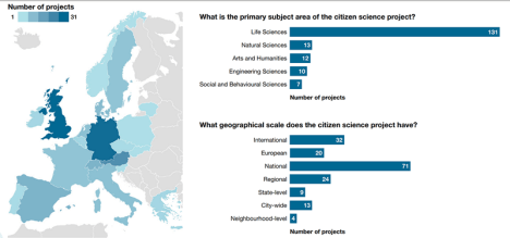 Map of citizen science activities across Europe (2016), project topic/field and geographical. Source: European Commission Open Science Monitor 27