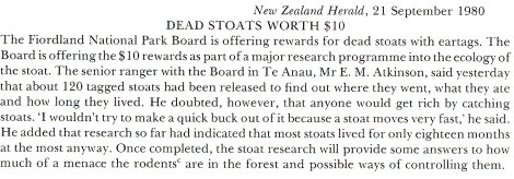In 1979, Dr Carolyn (Kim) King set up another project – this time to create a database of known aged stoats. Stoats develop lines (like growth rings) on the root of their canines, and these were suspected to appear annually. Just before the 1979 seed fall in Fiordland, 130 stoats (including more than 100 born in the that year) were live trapped, anaesthetised, then ear tagged and released. A poster hung in prominent public places (e.g., pubs) explained the study and asked that dead or trapped stoats with ear tags be sent back to Kim at the DSIR. This way, the dates of first capture and retrieval could be used to estimate the longevity of each stoat. Despite the information provided, some folks still ‘got the wrong end of the stick’…