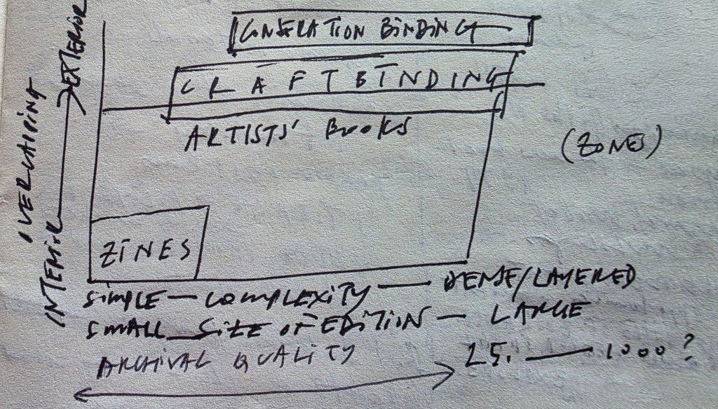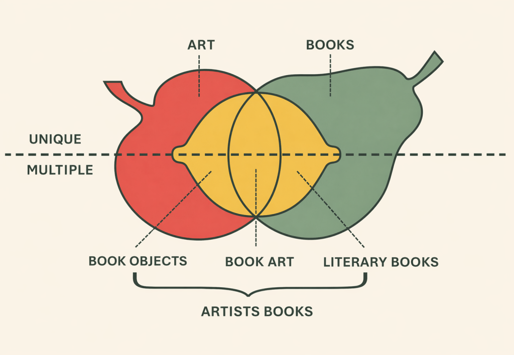 Last year’s Bind25 symposium (covered in the previous post) was a great introduction to the sheer breadth of book arts, prompting me to delve further into the scope of artist’s books. To show were artist’s books sit between artworks and commercially made books, Clive Phillpot, essayist and artist-creator developed a “fruit salad”-themed Venn diagram (1982):