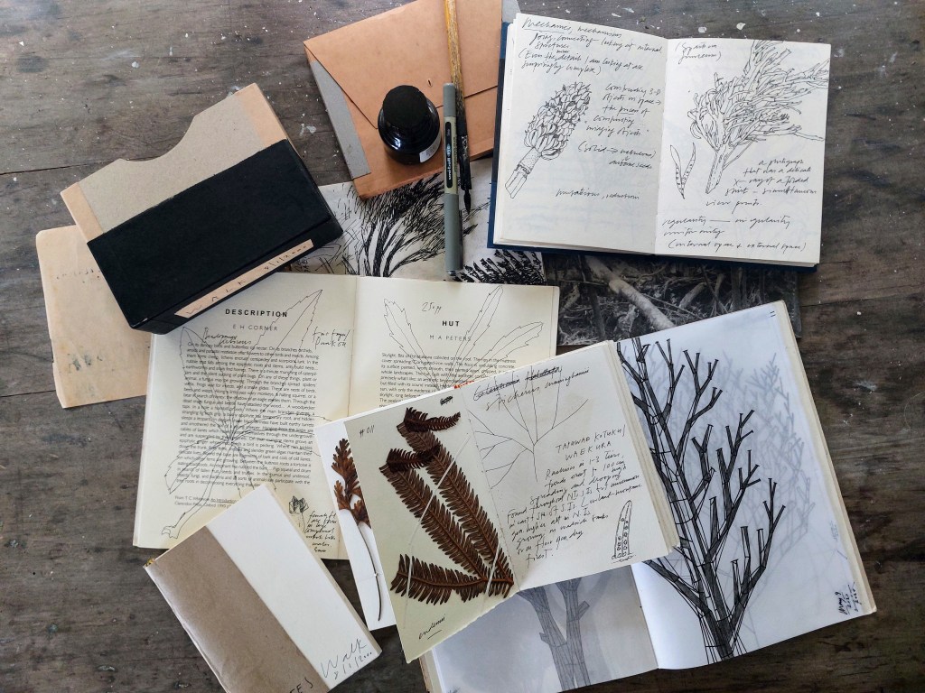 The layered human relationship to the natural world is the starting point for my creative work. I’m drawn to ecology, botany and taxonomy, each a discipline that orders and makes sense of nature. I’m fascinated by diagrams that reveal the intangible as concrete and known and how colonial and indigenous connections to nature are expressed. Responding to a largely transient lifestyle, my works are mostly ephemeral: drawings, printmaking, photograms, self-made artist’s books and journals documenting travels, insights and day-to-day life.